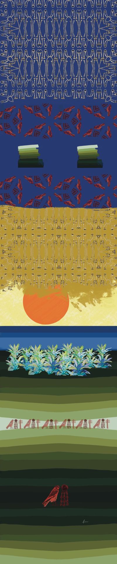La composición es ascendente, como una historia que se despliega por niveles: lo evidente al centro y lo oculto arriba y abajo en un diálogo constante. Los azules evocan memoria y profundidad; los verdes, renovación y un retorno suave a lo que se siente verdadero. El atardecer simboliza la comunión entre la conciencia —el sol que desciende— y las aguas y cielos que guardan lo indescifrable del universo… y de nuestro propio mundo interior.